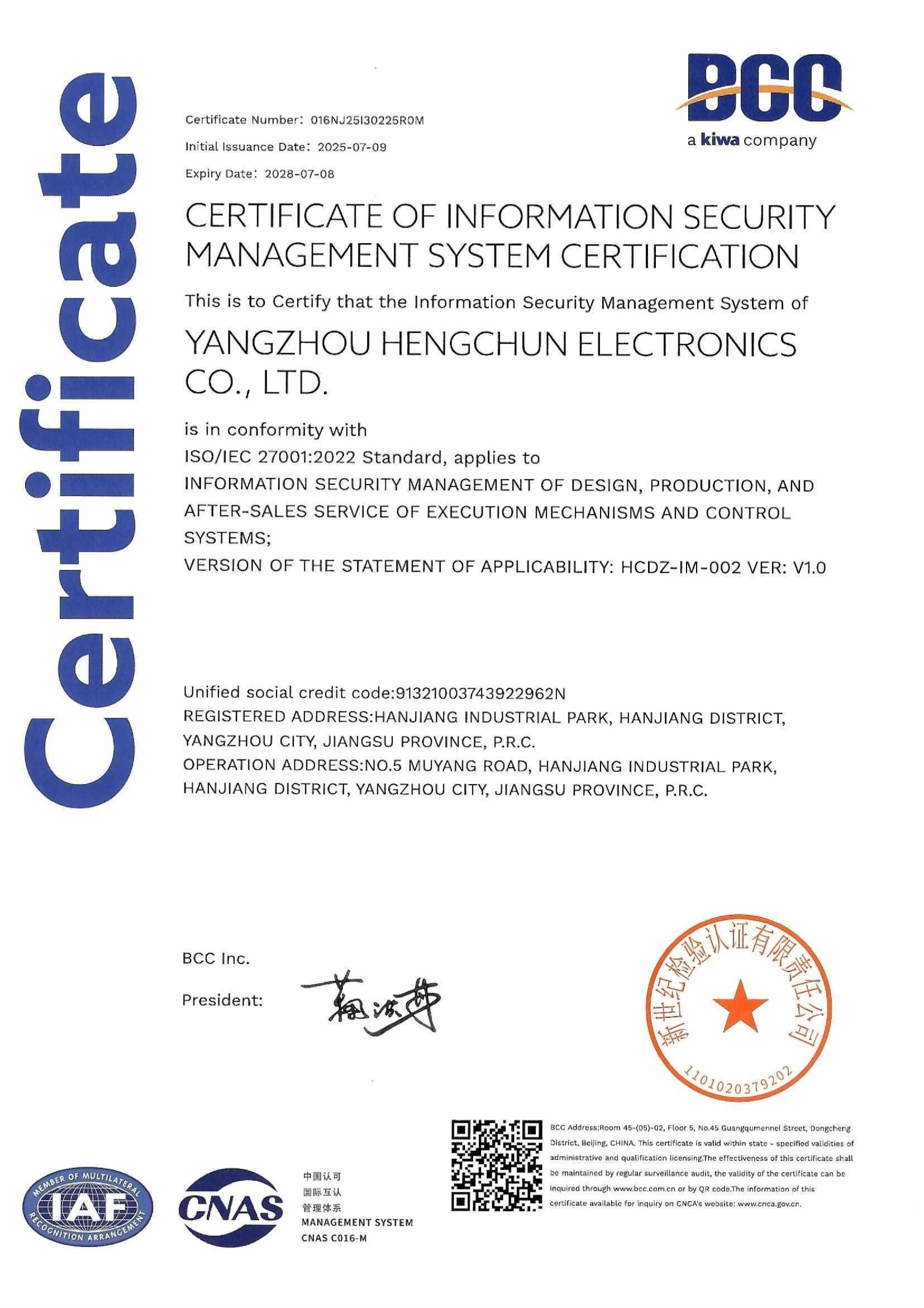 信息安全管理体系认证证书