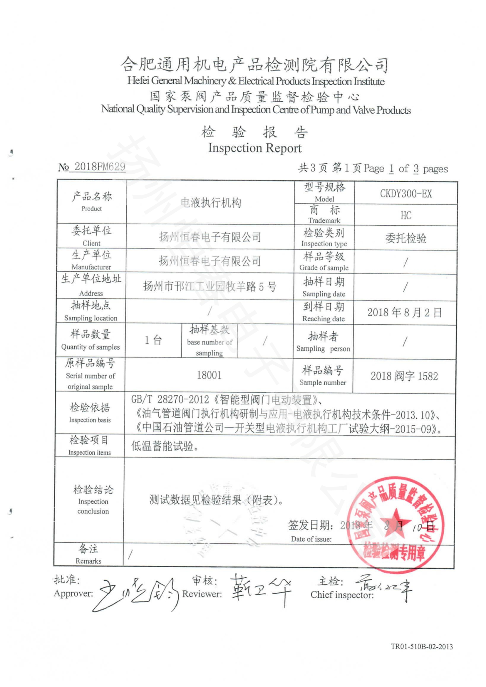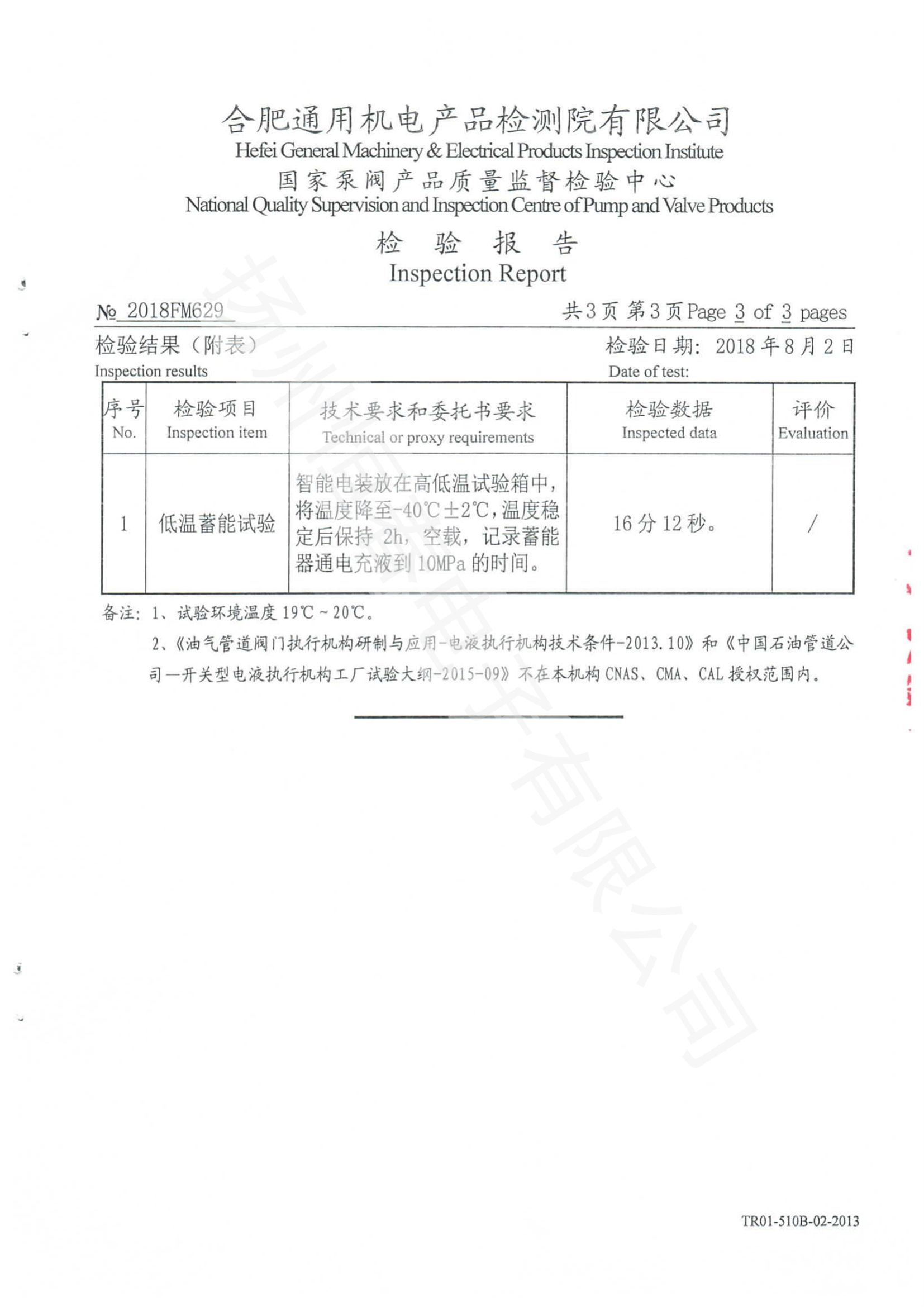 2018FM629检验报告电液低温蓄能试验 合肥所CKDY300