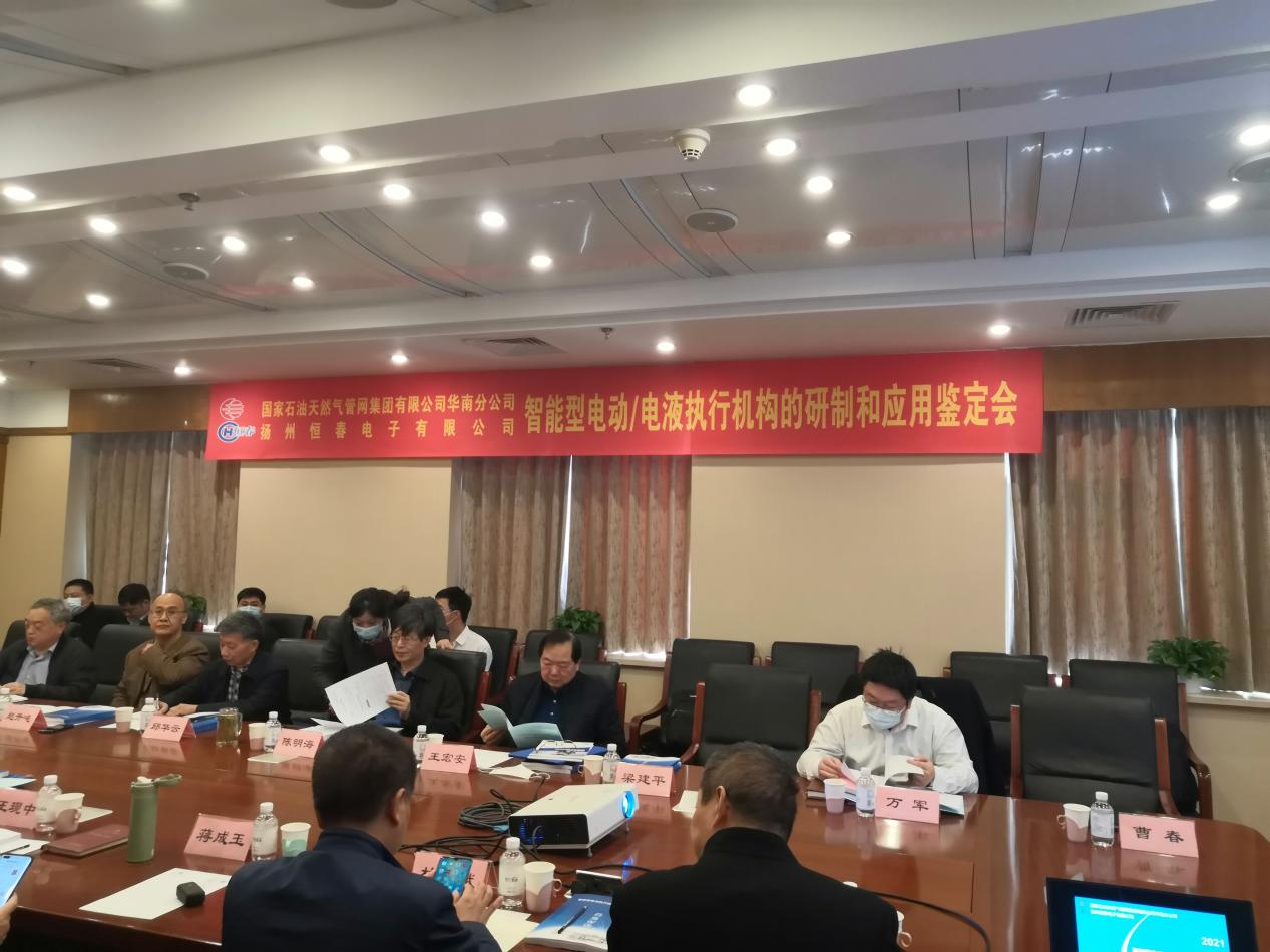 与会领导专家听取了新产品研制和技术总结报告,审查了性能检测报告和查新报告等相关鉴定资料,现场查看了两台新产品样机,经质询讨论后,鉴定委员会一致认为:国家石油天然气管网集团有限公司华南分公司与扬州恒春电子有限公司联合研制的智能型电动执行机构和智能型电液联动执行机构两项新产品,其主要性能指标达到国际水平,两项新产品顺利通过鉴定。