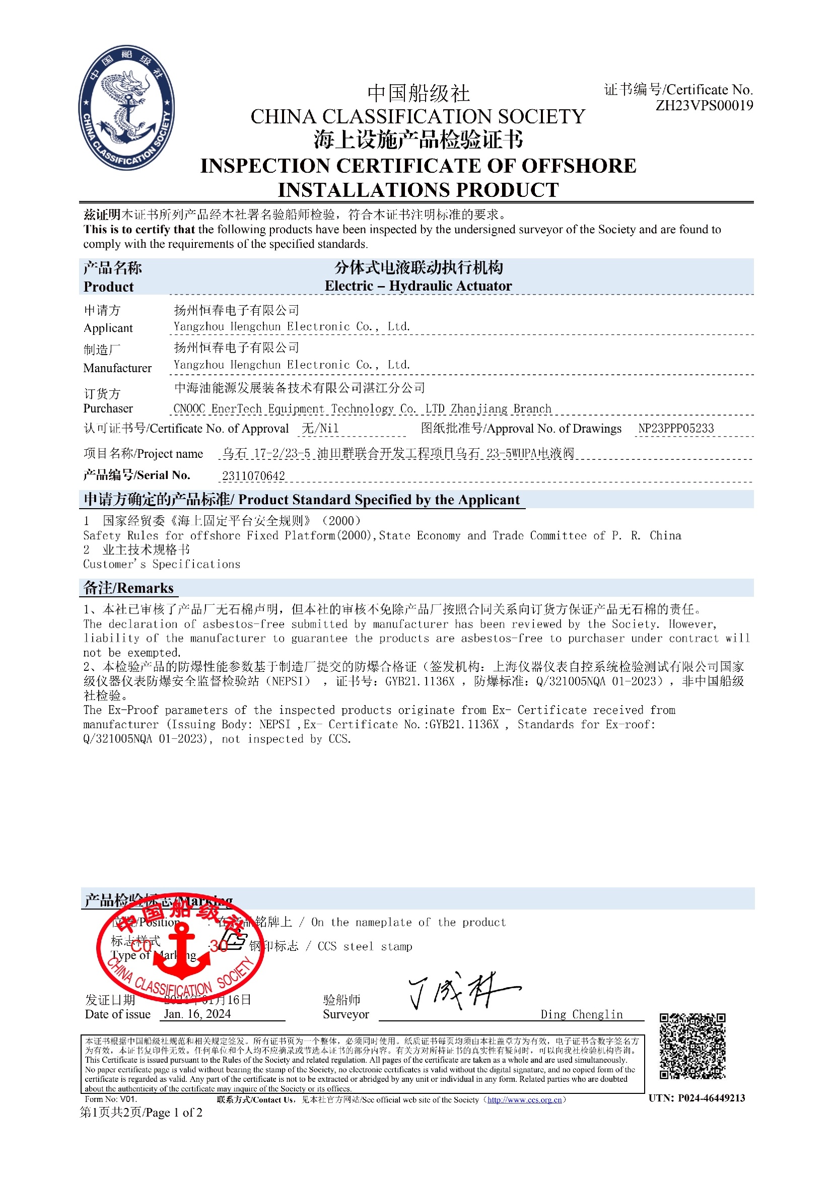 电液船级社检验证书
