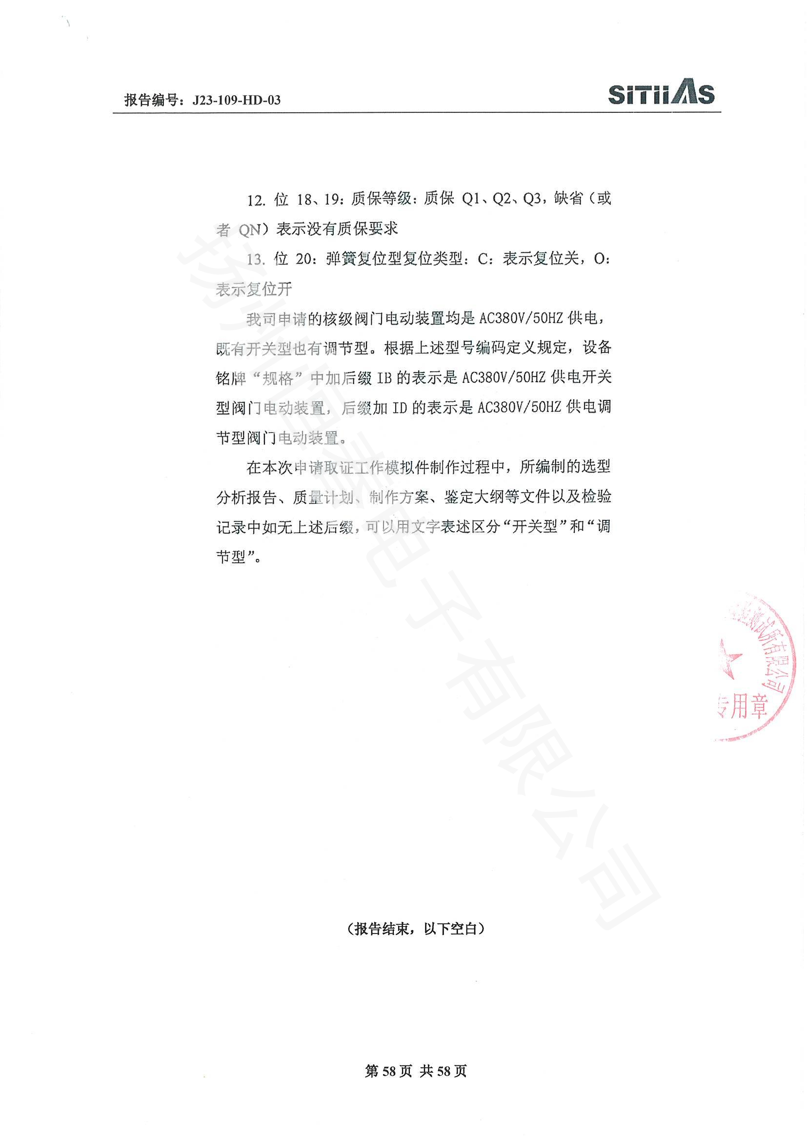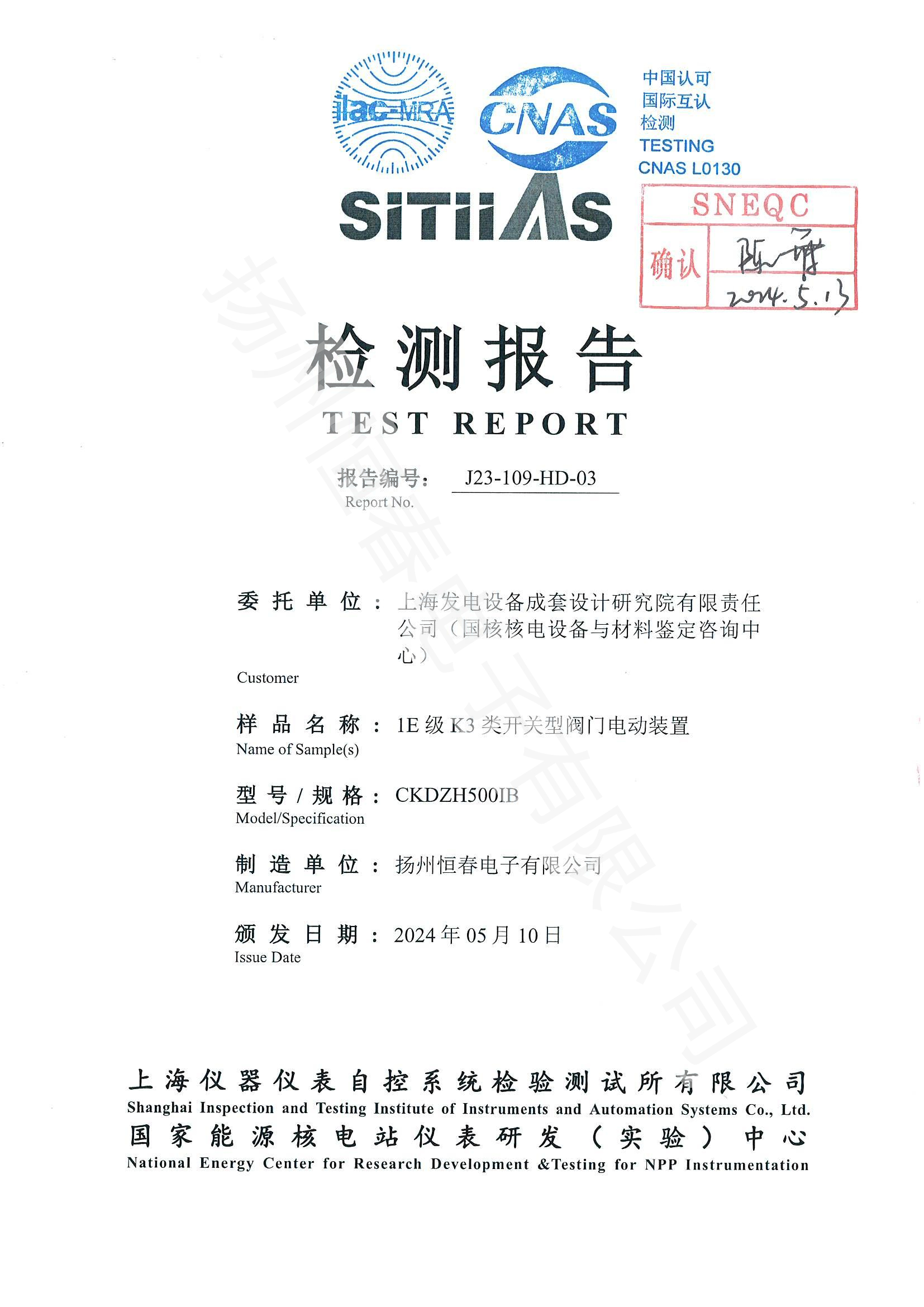 J23-109-HD-03 1E级K3类开关型阀门电动装置检测报告