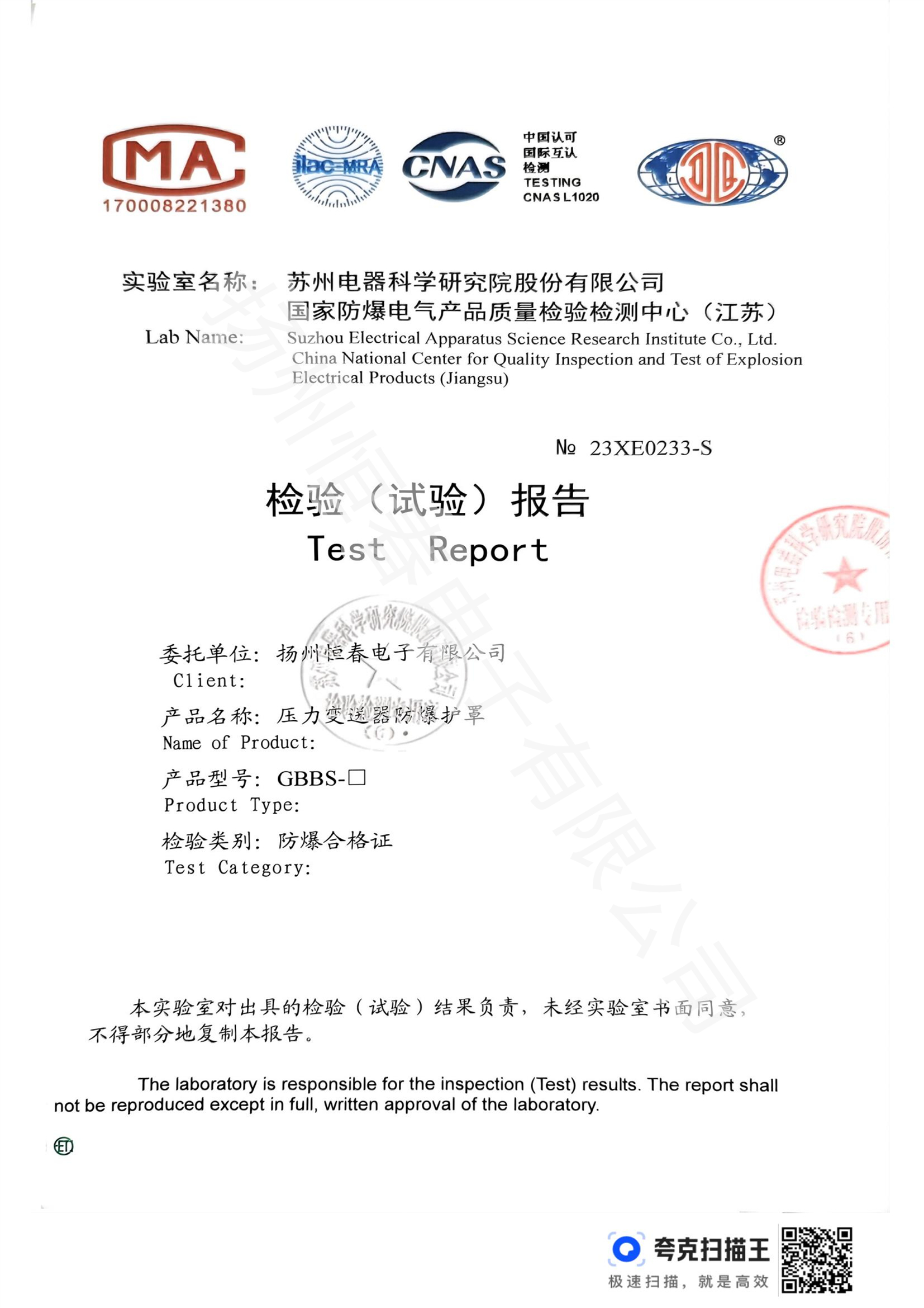 23XE0233-S 防爆合格证检测报告