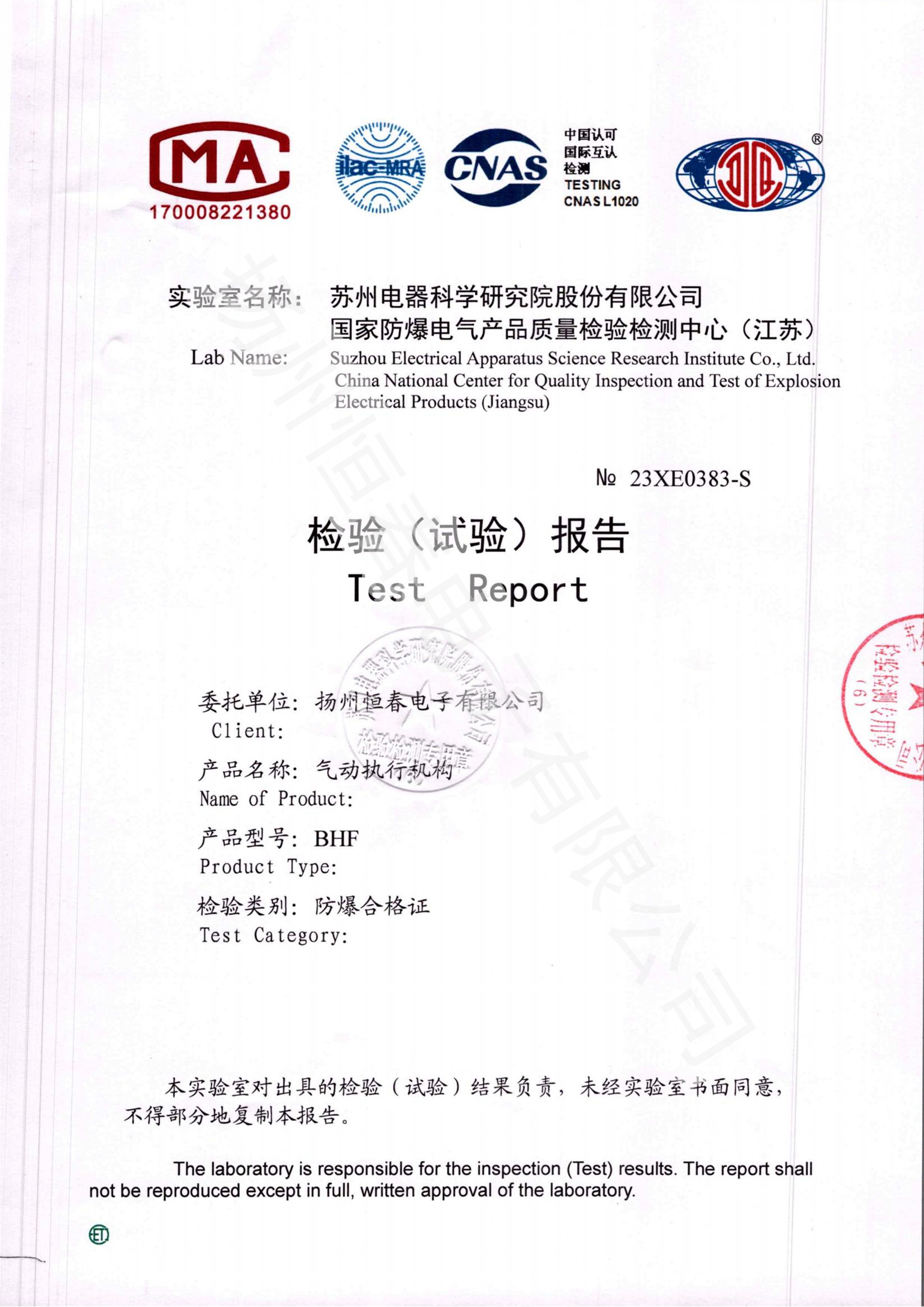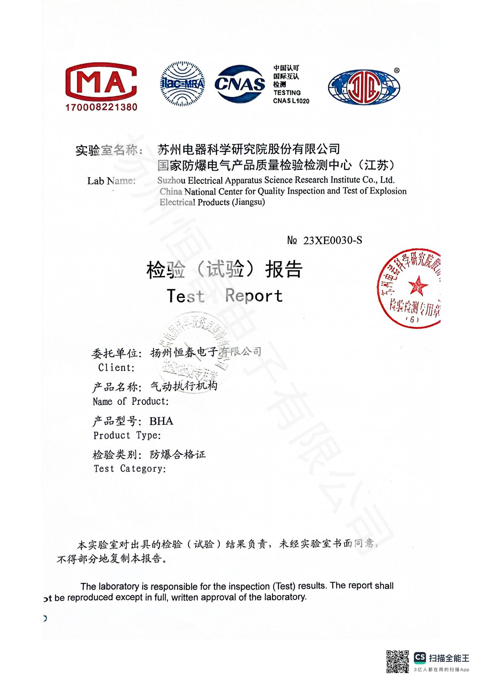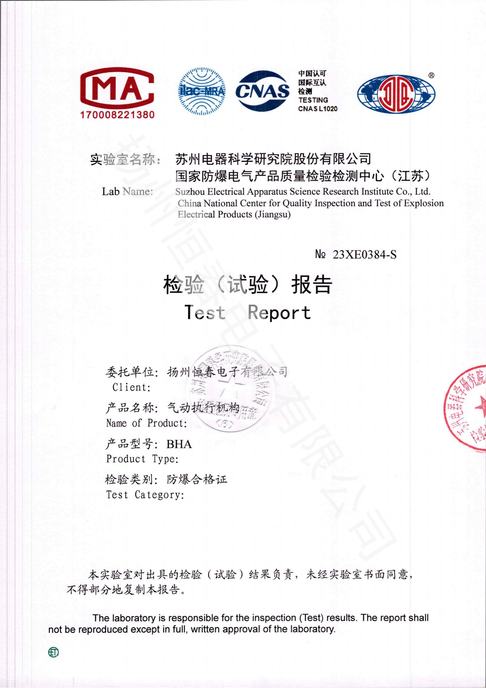 23XE0030-S BHA气动防爆合格证试验报告